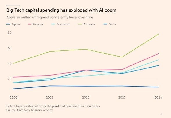 Bất chấp những tuyên bố của CEO Tim Cook về việc tăng cường đầu tư cho AI, các báo cáo tài chính cho thấy chi phí cho hạ tầng vật chất của hãng chỉ duy trì ở mức 3% doanh thu trong suốt nửa thập kỷ qua. Ngược lại, kể từ khi ChatGPT ra mắt vào năm 2022, Google, Microsoft, Amazon và Meta đã cam kết chi hàng trăm tỷ USD cho các trung tâm dữ liệu AI mới.