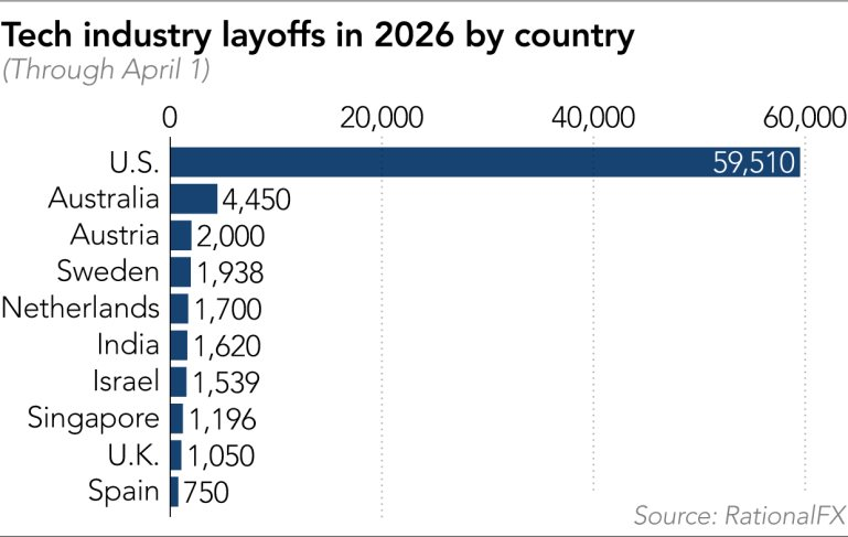 Số liệu phân tích từ RationalFX cho thấy một bức tranh khá ảm đạm: Tổng cộng 78.557 nhân viên công nghệ đã bị cắt giảm trong khoảng thời gian từ ngày 1/1 đến ngày 1/4/2026. Trong số đó, Mỹ chiếm tỷ trọng áp đảo với 76,7% tổng số ca sa thải.