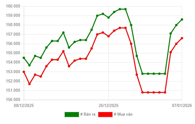 Tại Công ty Vàng bạc Sài Gòn (SJC), Công ty Bảo Tín Minh Châu, Tập đoàn Phú Quý và Tập đoàn DOJI, giá vàng miếng SJC được điều chỉnh tăng thêm 600 nghìn đồng/lượng ở cả chiều mua vào và bán ra, đưa mặt bằng giá lên vùng 156,6 – 158,6 triệu đồng/lượng. Khoảng cách giữa hai chiều giao dịch tiếp tục được giữ ở mức 2 triệu đồng/lượng.
