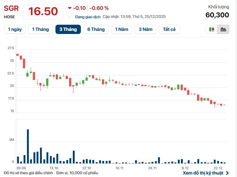 Trên thị trường chứng khoán, cổ phiếu SGR phiên 25/12 ở mức 16.500 đồng/cp, thấp nhất kể từ tháng 5/2023. Thị giá mã này đã giảm hơn 50% so với tháng 7/2025 và mất khoảng 65% so với đỉnh lịch sử thiết lập vào tháng 9/2024.