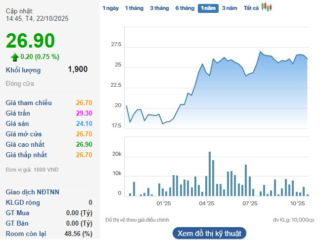 Kết phiên 22/10, cổ phiếu CTB có giá là 26.900 đồng/cp, tăng gần 50% so với đầu năm. Vốn hoá thị trường đạt 367 tỷ đồng.