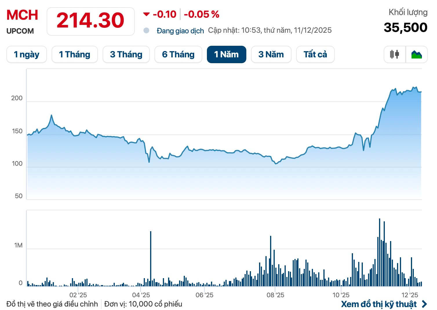 Trên sàn chứng khoán, cổ phiếu MCH đang neo cao vùng đỉnh với thị giá khoảng 214.000 đồng/cp, tăng 22% so với đầu năm. Cổ đông của Masan Consumer đã thông qua kế hoạch phát hành cổ phiếu từ nguồn vốn chủ sở hữu, tương ứng tỷ lệ 22,5%, tức cổ đông sở hữu 1.000 cổ phiếu sẽ nhận thêm 225 cổ phiếu mới.