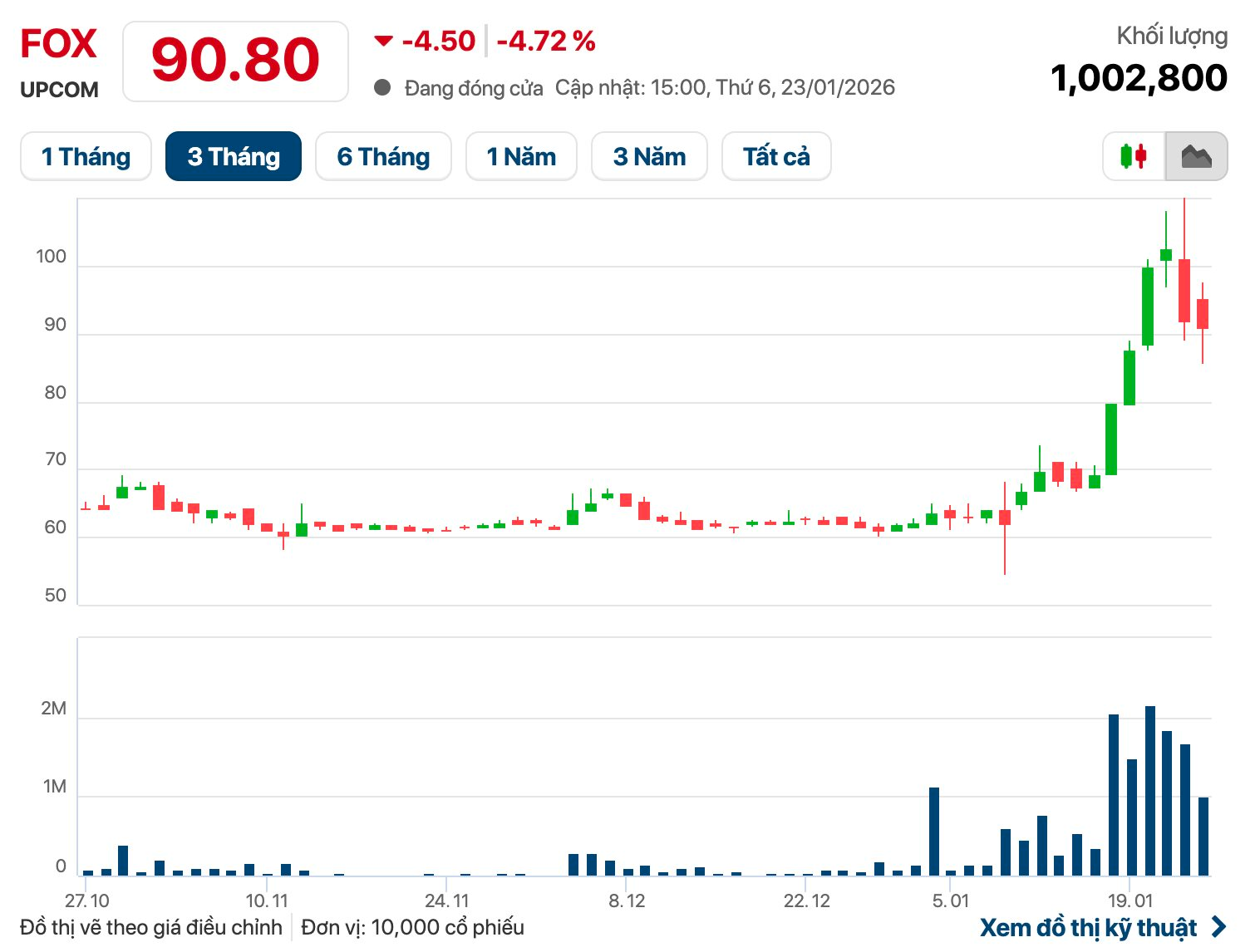 Trên thị trường chứng khoán, kết phiên giao dịch ngày 23/1/2026, cổ phiếu FOX ở mức 90.800 đồng/cổ phiếu, giảm 4.500 đồng so với phiên trước đó.