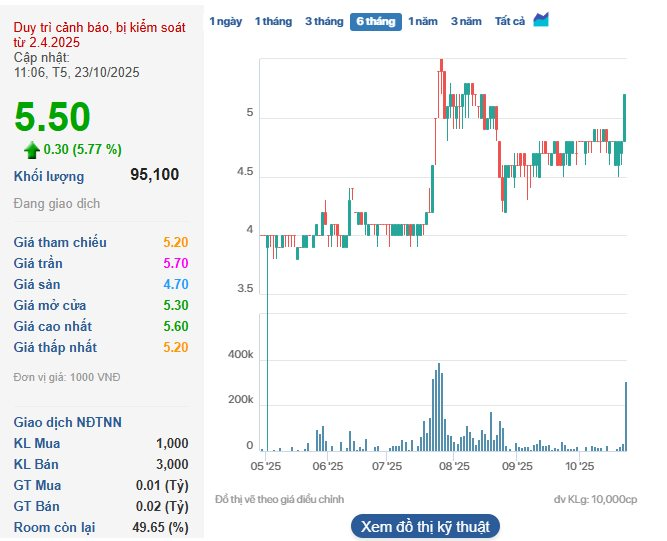 Phiên giao dịch ngày 23/10, cổ phiếu HOM vẫn duy trì đà tăng ấn tượng lên 5.500 đồng/cp sau phiên tăng trần lên 5.200 đồng/cp của ngày trước đó.