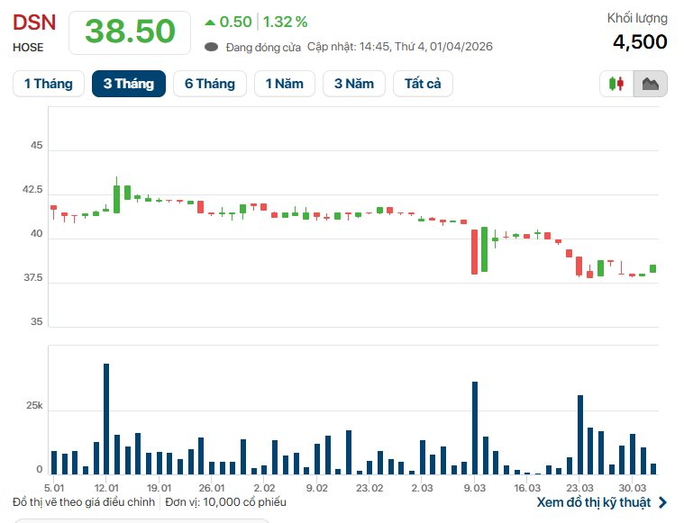 Kết phiên giao dịch 1/4, cổ phiếu DSN có giá là 38.500 đồng/cp. Vốn hoá thị trường đạt 465 tỷ đồng.