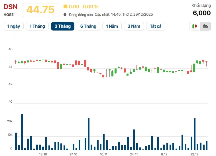 Trên thị trường, cổ phiếu DSN chốt phiên giao dịch 29/12 ở mốc 44.700 đồng/cp, giảm 15% so với hồi đầu năm.