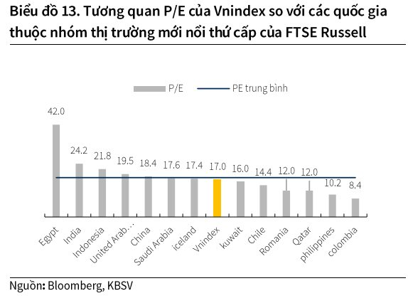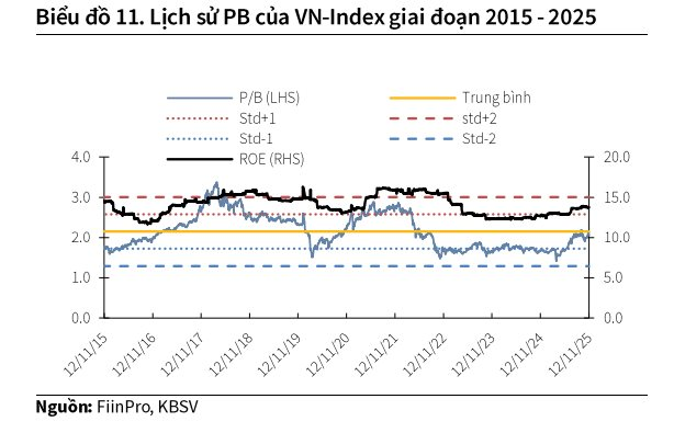 Thứ hai, kết quả kinh doanh của các doanh nghiệp niêm yết được kỳ vọng tích cực hơn trong bối cảnh Chính phủ đặt mục tiêu tăng trưởng GDP khoảng 10% cho năm 2026, qua đó giúp mặt bằng định giá trở nên hấp dẫn. KBSV cho biết P/E dự phóng của VN-Index ở mức khoảng 17,0 lần, thấp hơn mức trung bình 17,9 lần của nhóm thị trường mới nổi thứ cấp, cho thấy thị trường vẫn còn dư địa tăng giá.