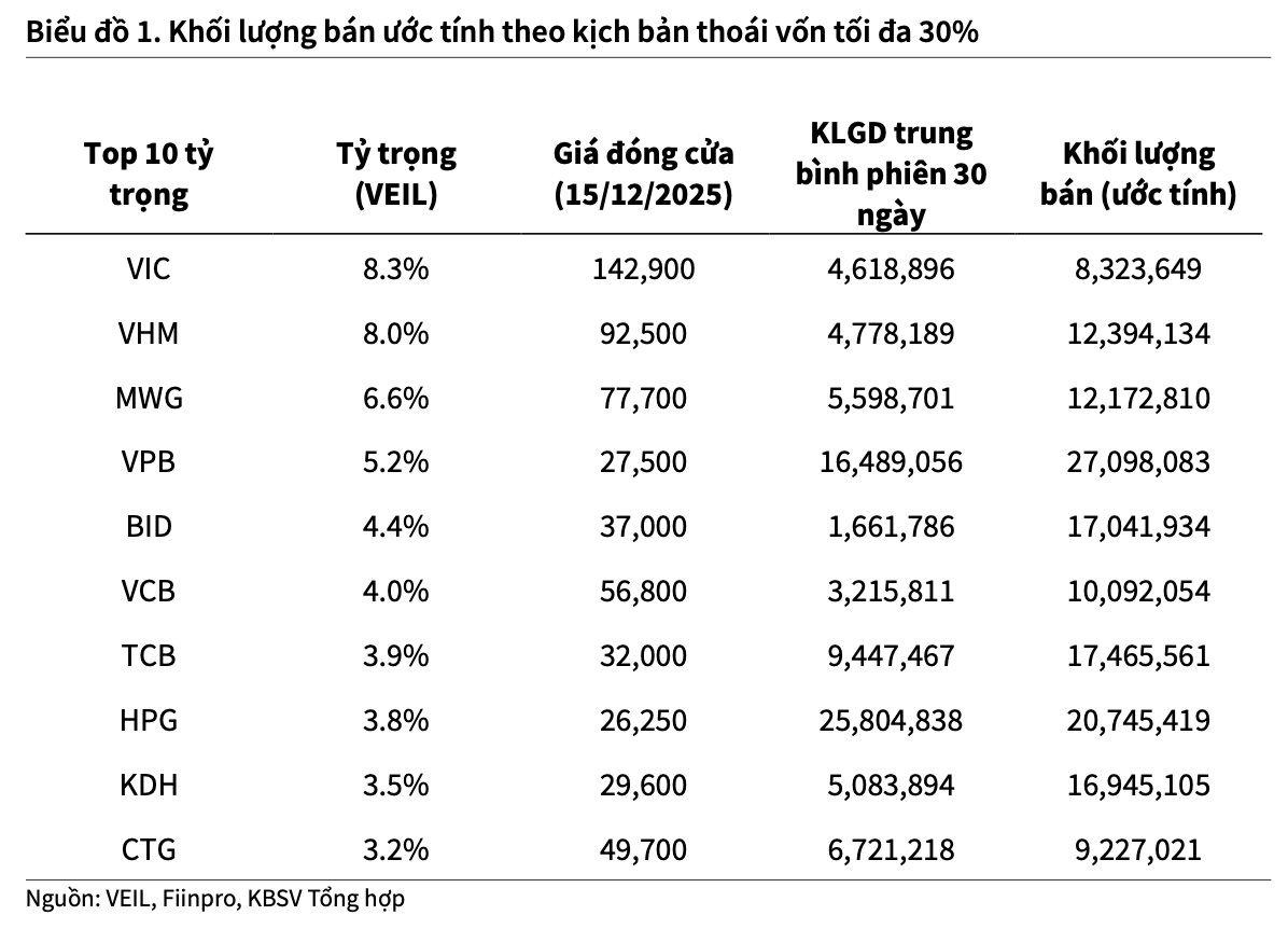 Hiện tại, top 10 tỷ trọng danh mục của VEIL đều là các Bluechips hàng đầu trên thị trường chứng khoán Việt Nam, bao gồm VIC, VHM, MWG, BID, VCB, TCB, HPG, KDH, CTG. Theo ước tính của KBSV, VEIL sẽ bán bớt lượng lớn, có thể lên đến hàng chục triệu đơn vị trên mỗi cổ phiếu trong kịch bản thoái vốn tối đa 30%.