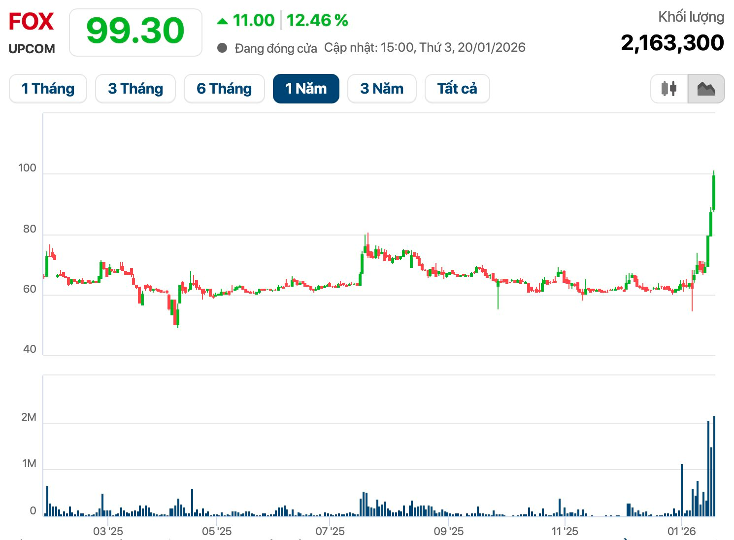 Cổ phiếu FPT Telecom (mã FOX) đang thu hút sự chú ý đặc biệt trên sàn chứng khoán khi tăng “bốc đầu” 3 phiên liên tiếp, lập đỉnh mới. Từ đầu năm 2026, thị giá FOX đã tăng 56% lên mức 99.300 đồng/cp. Vốn hóa thị trường của FPT Telecom cũng theo đó lập kỷ lục hơn 73.000 tỷ đồng, tăng gần 29.000 tỷ kể từ khi về với Bộ Công an.