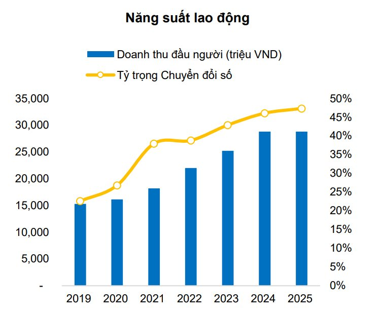 Theo BVSC, FPT đang định hướng đúng trong quá trình tiến hoá của ngành dịch vụ CNTT. Với chiến lược “AI-First”, FPT trong những năm gần đây đã sử dụng nhiều hơn các công cụ AI để cải tiến năng suất lao động. Hàm lượng giá trị gia tăng trong cơ cấu doanh thu dịch vụ CNTT quốc tế của doanh nghiệp cũng liên tục cải thiện mới mức tăng trưởng mảng Chuyển đổi số (DX) cao hơn bình quân và giá trị doanh thu mỗi đầu nhân sự liên tục tăng mạnh qua các năm.