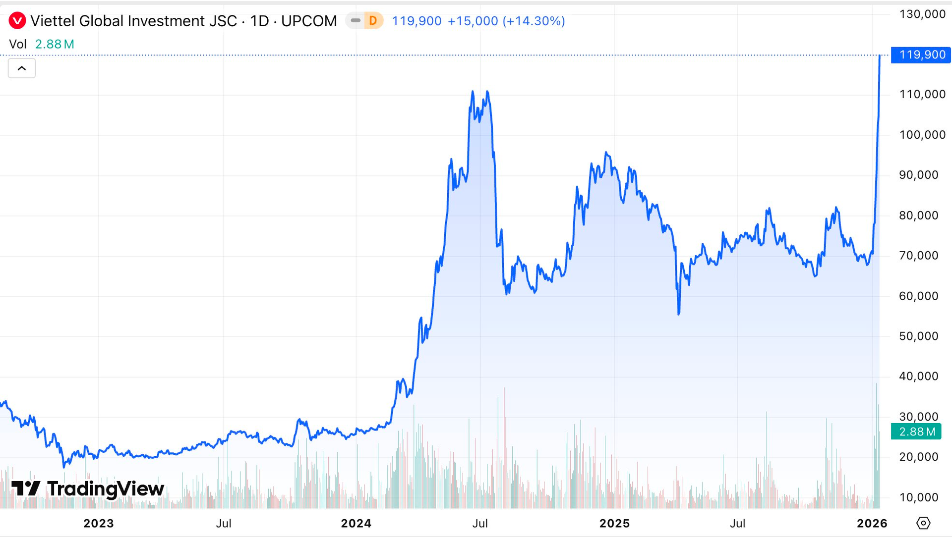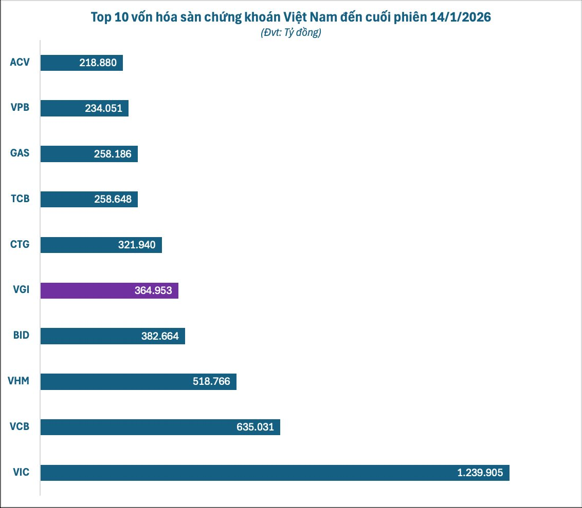 Trên thực tế, đà tăng của cổ phiếu VGI theo cùng diễn biến với nhóm "Viettel", bắt đầu từ phiên tuần trước 7/1. Xuyên suốt 6 phiên VGI đều đóng cửa tăng tốt, đưa mã này trở thành một trong những cổ phiếu "hot" nhất những phiên đầu năm mới. Vốn hoá thị trường của Viettel Global vượt mức 348.516 tỷ đồng, tương ứng 13,4 tỷ USD. Chỉ trong nửa tháng đầu năm 2026, giá trị vốn hoá Viettel Global đã tăng thêm hơn 149.400 tỷ đồng, đưa doanh nghiệp này vào nhóm 5 công ty có giá trị vốn hóa lớn nhất toàn thị trường chứng khoán.