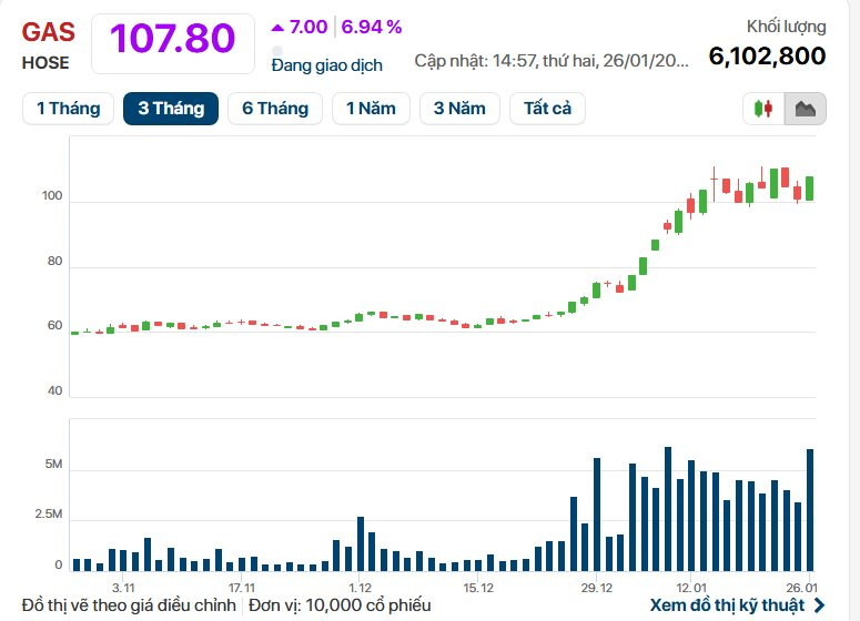 Nhìn lại biểu đồ 3 tháng qua, GAS đã duy trì đà tăng ổn định từ vùng giá 60.000 đồng vào cuối tháng 10/2025, trước khi xác lập cột mốc giá hiện tại.