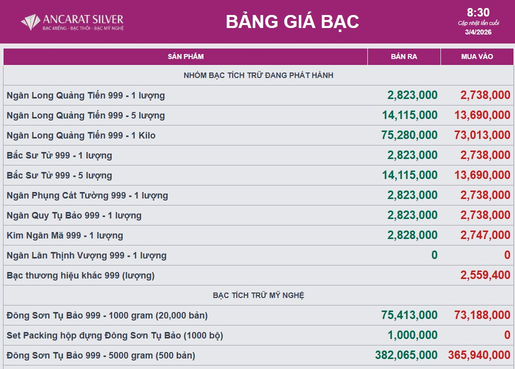 Tại Công ty Cổ phần Kim Loại Quý Ancarat Việt Nam, giá bạc hôm nay niêm yết ở mức 2.738.000 đồng/lượng (mua vào) và 2.823.000 đồng/lượng (bán ra) tại Hà Nội.