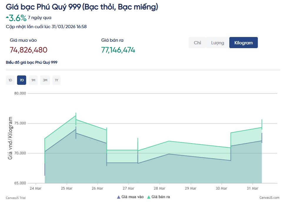 Trong nước, giá bạc cũng ghi nhận xu hướng tăng theo diễn biến thế giới. Theo dữ liệu từ Tập đoàn Vàng bạc Đá quý Phú Quý, bạc 999 1kg có giá 74,8 triệu đồng/thỏi (mua vào) và 77,1 triệu đồng/thỏi (bán ra), phục hồi sau khi biến động mạnh.