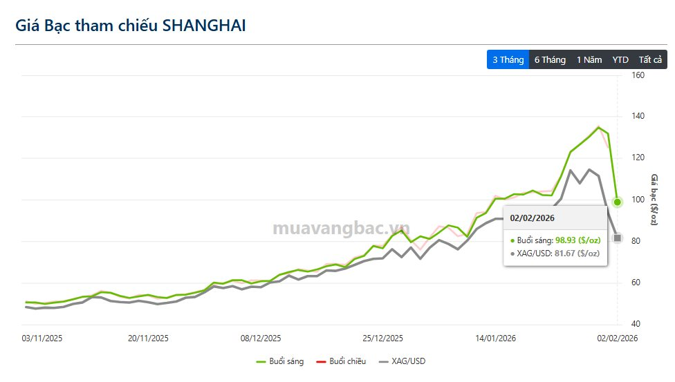 Sáng 2/2, giá bạc vật chất tại Thượng Hải lao dốc gần 33 USD/ounce, xuống còn quanh 99 USD/ounce, tương đương mức giảm khoảng 25%. Trên sàn COMEX (Mỹ), giá bạc cũng rơi thẳng đứng về vùng 82 USD/ounce, thấp hơn hơn 17 USD/ounce so với giá tại Thượng Hải.