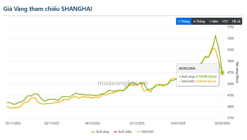 Cùng xu hướng, giá vàng Thượng Hải giảm về khoảng 4.758 USD/ounce, trong khi giá vàng thế giới lùi xuống quanh 4.730 USD/ounce, mất gần 15% so với mức đỉnh kỷ lục chỉ vài phiên trước đó.