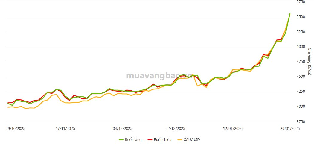 Không chỉ bạc, thị trường kim loại quý tại Trung Quốc còn chứng kiến đà tăng bứt phá của vàng. Giá vàng tại Thượng Hải leo lên 5.554 USD/ounce, trong khi giá vàng thế giới cũng tăng vọt lên 5.545 USD/ounce, mức cao chưa từng ghi nhận. Đây không phải là một phiên tăng đơn lẻ, mà là chuỗi tăng mang tính lịch sử khi giá vàng đã tăng liên tiếp 7 phiên, chuỗi dài nhất kể từ tháng 3/2025, với tổng mức tăng khoảng 713 USD, tương đương hơn 15% chỉ trong một tuần giao dịch.