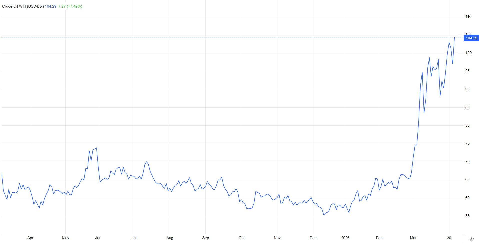 Cùng lúc đó, giá dầu thô ngọt nhẹ West Texas Intermediate của Mỹ cũng tăng thêm 4,17 USD, tương đương 4,2%, đạt ngưỡng 104,29 USD/thùng.