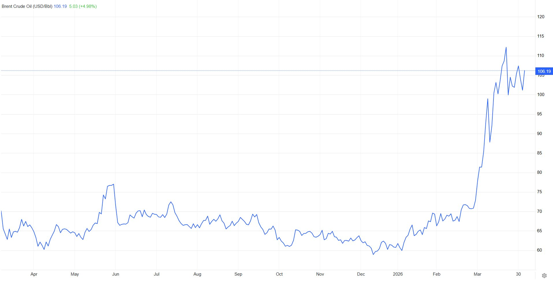 Theo ghi nhận vào lúc 9h20 sáng (theo giờ Việt Nam), giá dầu Brent giao kỳ hạn đã ghi nhận mức tăng mạnh 5,03 USD, lên 106,19 USD/1 thùng, tương đương mức tăng 4,98%.