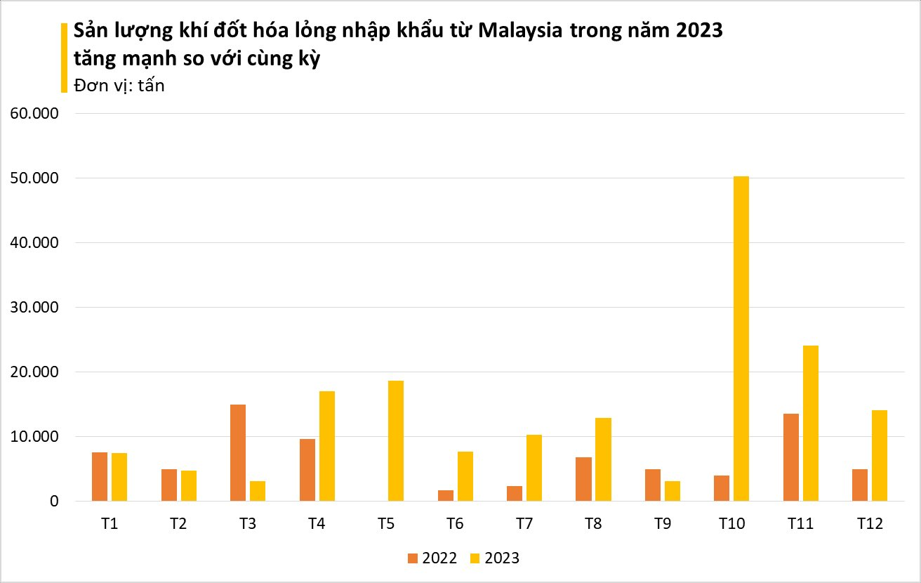 Tính chung trong 12 tháng năm 2023, Việt Nam đã chi hơn 1,55 tỷ USD để nhập khẩu trên 2,5 triệu tấn khí đốt hóa lỏng từ các thị trường, tăng 27,9% về lượng và tăng 1,1% về trị giá so với cùng kỳ năm 2022. Giá nhập khẩu trung bình trong 12 tháng đầu năm đạt 618,6 USD/tấn, giảm gần 21% so với cùng kỳ năm trước.