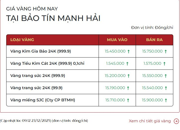 Trong 24 giờ gần nhất, các loại vàng trang sức và vàng 24K tại Bảo Tín Mạnh Hải cũng cho thấy biến động tăng nhẹ hoặc giữ giá sát mức đỉnh của tuần, trong đó vàng Kim Gia Bảo 24K niêm yết ở mức khoảng 15,45 – 15,75 triệu đồng/chỉ, vàng trang sức 24K ghi nhận mức khoảng 15,19 – 15,55 triệu đồng/chỉ.