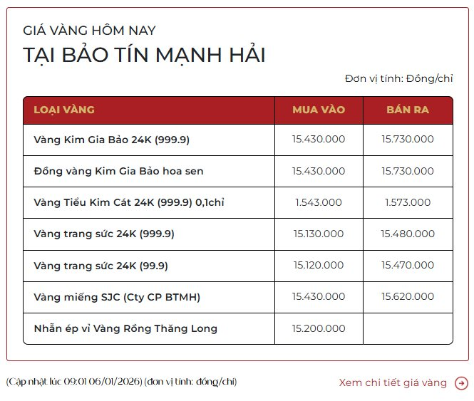 Tại hệ thống Công ty Cổ phần Vàng Bạc Đá Quý Bảo Tín Mạnh Hải, theo bảng giá cập nhật vào buổi sáng nay, vàng miếng SJC BTMH được mua vào khoảng 15,43 triệu đồng/chỉ và bán ra khoảng 15,62 triệu đồng/chỉ.