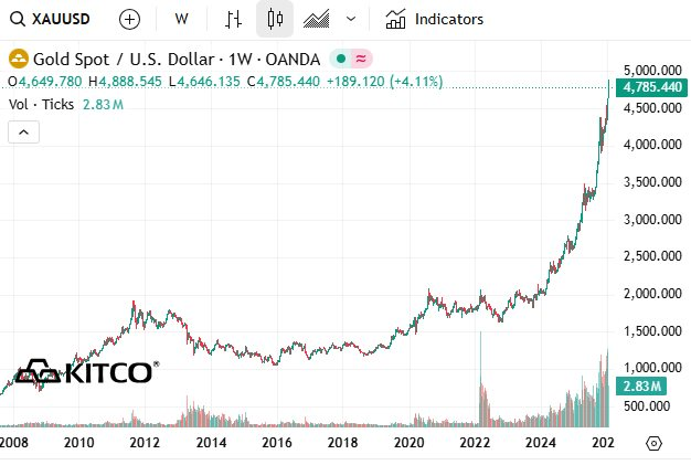 Giá vàng và bạc tiếp tục duy trì đà tăng mạnh, tiến gần mốc mục tiêu lần lượt là 5.000 USD/ounce và 100 USD/ounce. Tuy nhiên, theo các nhà phân tích do Hiệp hội Thị trường Kim loại quý London (LBMA) khảo sát, đây có thể chỉ là mức kháng cự nhỏ trong một xu hướng tăng mạnh hơn nhiều trong năm nay.