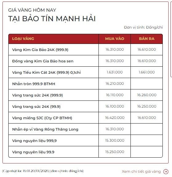 Tại thị trường Việt Nam, sự cộng hưởng từ đà tăng thế giới đã ngay lập tức đẩy giá vàng trong nước vào một đợt tăng dựng đứng. Theo ghi nhận mới nhất trong chiều ngày 20/1, giá vàng miếng SJC tại các thương hiệu lớn đã đồng loạt được điều chỉnh tăng thêm khoảng 1,1 triệu đồng/lượng so với phiên sáng.