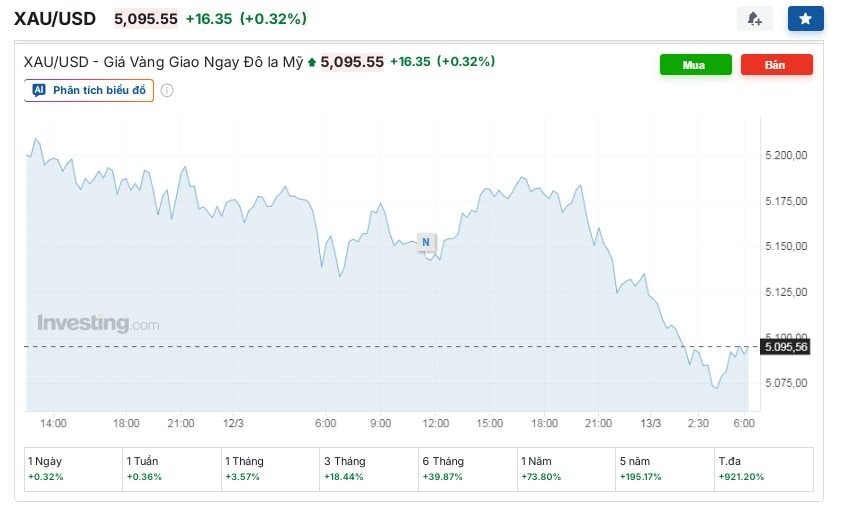 Theo ghi nhận từ sàn Kitco vào sáng nay (13/3/2026), giá vàng giao ngay đang niêm yết ở ngưỡng 5.095 USD/ounce, giảm mạnh hơn 80 USD/ounce so với phiên giao dịch liền trước. Đây là một bước lùi đáng kể sau khi vàng liên tục thiết lập các cột mốc lịch sử trên ngưỡng 5.200 USD/ounce vào những ngày đầu tuần.