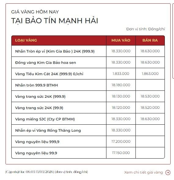 Tương tự, giá vàng nhẫn Kim Gia Bảo của Bảo Tín Mạnh Hải cũng giảm nhẹ, từ 183,5-186,5 triệu đồng/lượng xuống còn 183,3-186,3 triệu đồng/lượng (mua vào-bán ra).