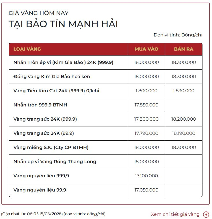 Theo dữ liệu từ Kitco và Trading Economics tính đến sáng ngày 18/03/2026, giá vàng giao ngay (spot gold) đang niêm yết quanh mức 5.001 USD/ounce. Trong phiên giao dịch đêm qua, đã có thời điểm vàng bứt phá lên mức cao nhất là 5.044 USD/ounce trước khi quay đầu điều chỉnh giảm khoảng 43 USD về vùng giá hiện tại.