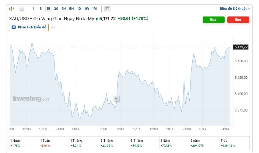 Số liệu cập nhật của Investing.com sáng 7/3 thì cho thấy giá vàng ở mức 5.171,72 USD/ounce.