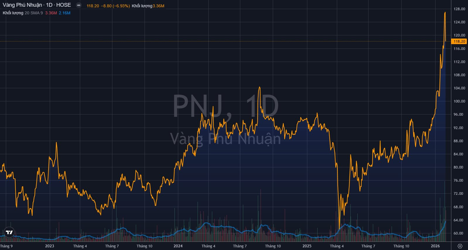 Tại mức giá này, vốn hóa của PNJ chỉ còn khoảng 40.300 tỷ đồng, bốc hơi hơn 3.000 tỷ đồng chỉ sau một phiên giao dịch.