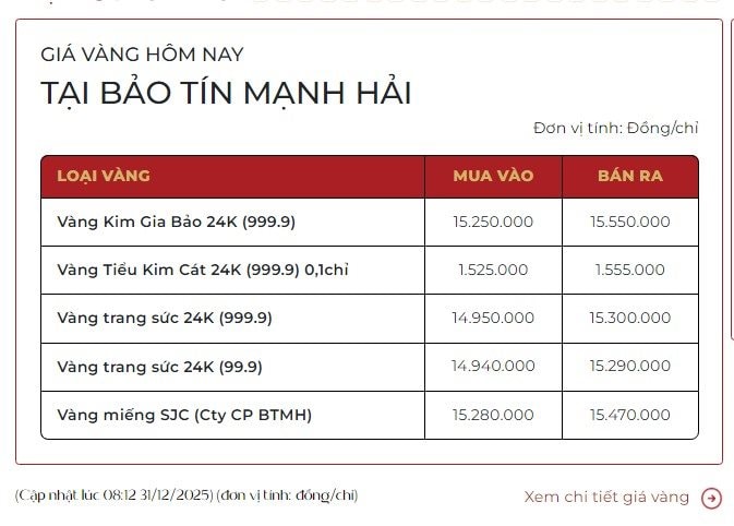 Bảo Tín Mạnh Hải ghi nhận mức biến động tương tự với sự điều chỉnh giảm đáng kể để bám sát diễn biến chung của thị trường nội địa. Giá vàng nhẫn (Kim Gia Bảo 24K) mua vào dao động quanh ngưỡng 152,5 triệu đồng/lượng và bán ra ở mức 155,5 triệu đồng/lượng.