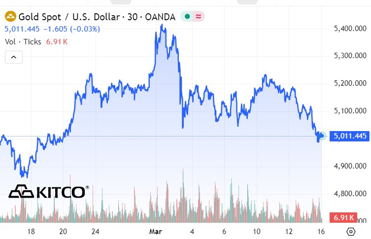 Giá vàng có thời điểm bật tăng mạnh, vượt mốc 5.020 USD/ounce trước khi chững lại và dao động trong vùng 5.015 – 5.030 USD/ounce. Đà tăng chủ yếu đến từ nhu cầu phòng ngừa rủi ro của nhà đầu tư. Lực mua chưa đủ mạnh để tạo cú bứt phá rõ rệt khi thị trường vẫn thận trọng trước triển vọng lãi suất.