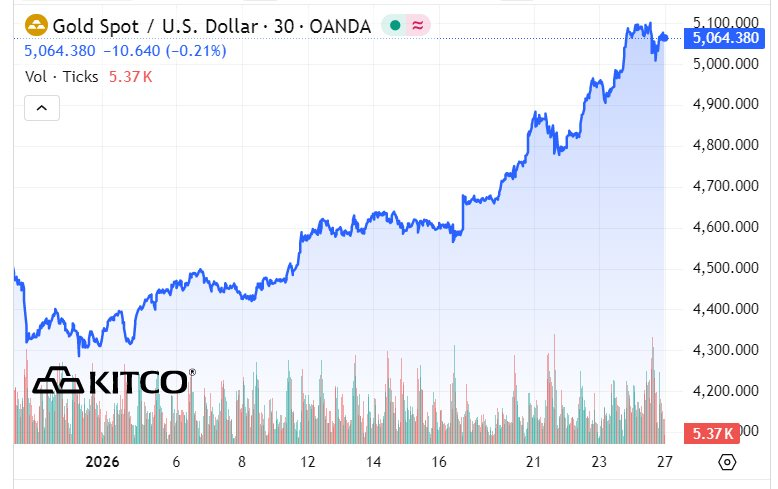 Trên thị trường quốc tế, giá vàng giao ngay hiện giao dịch ở 5.064,5 USD/ounce, giảm nhẹ 3,2 USD/ounce so với cùng thời điểm phiên trước. Quy đổi theo tỷ giá của Vietcombank, giá vàng thế giới tương đương 160,8 triệu đồng/lượng (chưa gồm thuế và phí), thấp hơn giá trong nước khoảng 16,2 triệu đồng/lượng.
