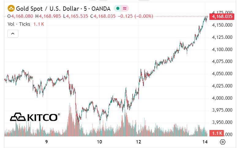 Đầu tuần trước, kim loại quý lần đầu vượt mốc 4.000 USD/ounce và tiếp tục bứt phá sau khi Tổng thống Mỹ Donald Trump tuyên bố áp thuế nhập khẩu 100% với hàng Trung Quốc, trong bối cảnh Trung Quốc hạn chế xuất khẩu đất hiếm và quỹ SPDR Gold Trust đẩy mạnh mua vào vàng.
