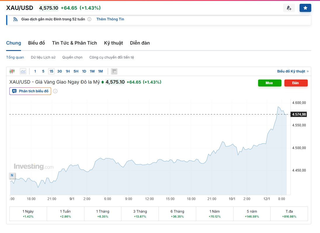 Từ mức khởi đầu tuần quanh ngưỡng 4.370 USD/ounce, vàng đã thực hiện một cú bứt tốc ngoạn mục để chốt phiên tuần tại vùng 4.510 USD/ounce, thậm chí có những thời điểm trong phiên sáng nay đã chạm tới sát mốc 4.600 USD/ounce. Đây là mức tăng tương đương 4% chỉ trong 7 ngày.