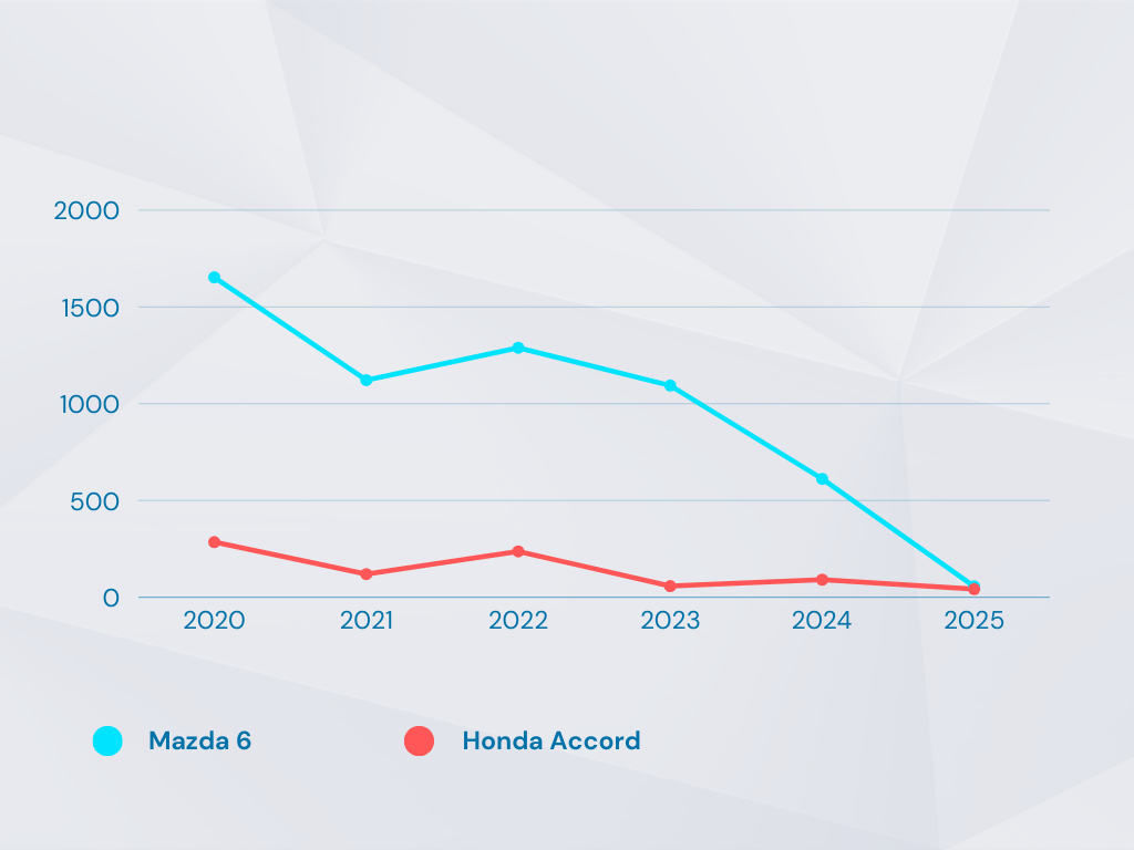 Mazda6 cũng lao dốc với 56 xe bán ra và đã ngừng nhận đặt cọc từ cuối tháng 9/2025. Đây là mức tiêu thụ được đánh giá thấp kỷ lục trong phân khúc. Tại các đại lý, Accord và Mazda6 đã ngừng nhận đơn đặt hàng mới, đồng thời không còn xuất hiện trong danh mục sản phẩm chính thức.