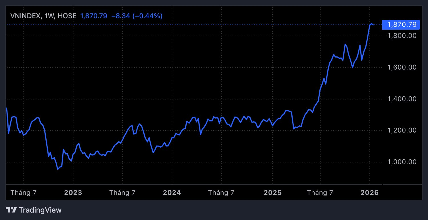 Chuyên gia cho rằng VN-Index đã tăng khoảng 200 điểm kể từ cuối năm 2025, trong bối cảnh nhiều nhóm cổ phiếu như dầu khí, nhóm cổ phiếu có yếu tố Nhà nước, khu công nghiệp, bán lẻ… tăng mạnh nhờ dòng tiền luân chuyển. Sau khi chỉ số vượt mốc 1.800 điểm, thanh khoản đã cải thiện rõ rệt và duy trì quanh 20.000 – 35.000 tỷ đồng/phiên, cho thấy dòng tiền vào thị trường khá tốt. Tuy nhiên, điều này cũng đồng nghĩa lượng cung tiềm năng gia tăng.