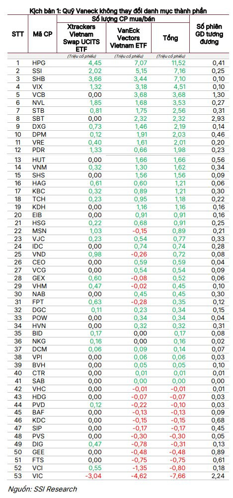 Về giao dịch, trong kịch bản 1, khi danh mục được giữ nguyên không thay đổi, SSI cho rằng nhóm cổ phiếu dự kiến được mua vào mạnh nhất gồm HPG với khoảng 7 triệu cổ phiếu, tiếp theo là SSI khoảng 5,1 triệu và VCB gần 3,6 triệu cổ phiếu.