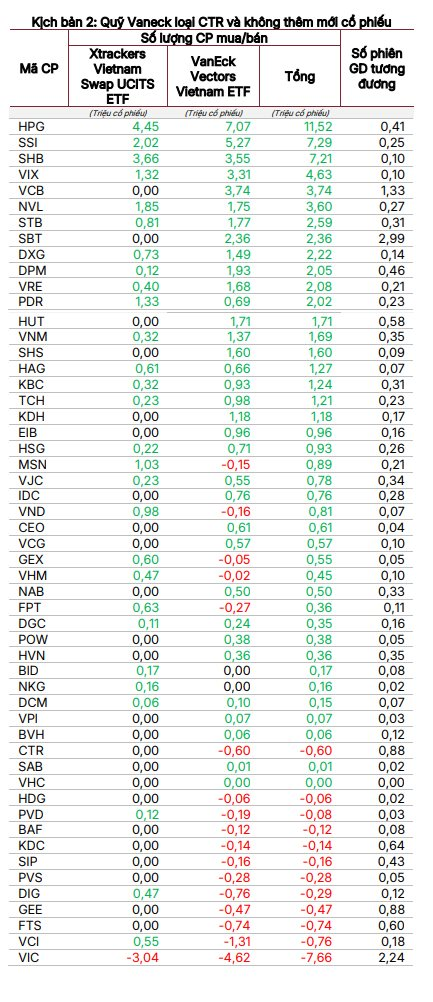 Với kịch bản 2, nếu CTR bị loại khỏi danh mục và không có mã mới được thêm vào, cổ phiếu HPG có thể đươc mua vào khoảng 7 triệu cổ phiếu, theo sau là SSI hơn 5,2 triệu và VCB khoảng 3,7 triệu cổ phiếu.