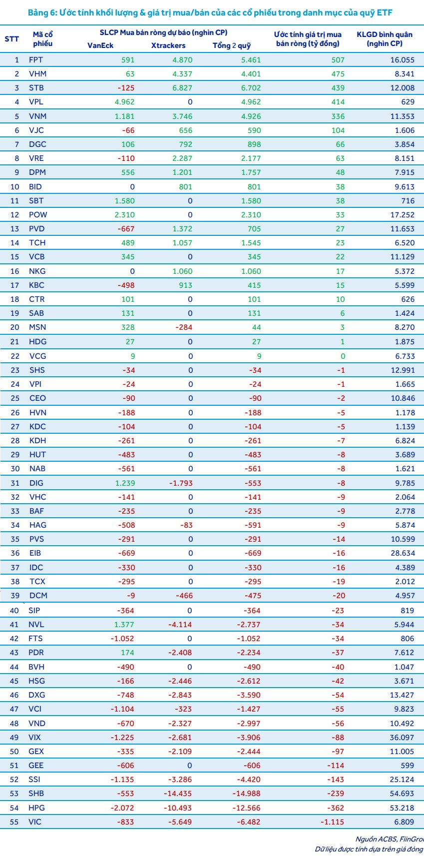 Trong các cổ phiếu được mua bán trong kỳ cơ cấu lần này, nổi bật đáng lưu ý là VPL với khối lượng giao dịch hàng ngày 629 triệu cổ phiếu, quỹ VanEck mất khoảng 7,8 phiên để hoàn tất việc mua thêm VPL. Ngoài ra, hầu hết các cổ phiếu dự kiến được mua bán trong 1 phiên, ngoại trừ SBT (2,2 phiên) và FTS (1,3 phiên).
