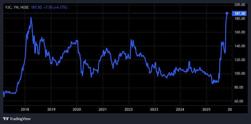 Giá cổ phiếu VJC phản ánh sự tăng trưởng mạnh mẽ của hãng từ đầu năm, cùng triển vọng tích cực khi nhiều đơn hàng tàu bay mới, hiện đại sắp được triển khai. Vietjet vừa đón thêm tàu bay thân rộng A330, nâng tổng đội bay (bao gồm Vietjet Thái Lan và Vietjet Qazaqstan) lên 130 chiếc. Hãng cũng khởi công Trung tâm Kỹ thuật Bảo dưỡng Tàu bay tại Cảng Hàng không Quốc tế Long Thành, một trong 80 công trình tiêu biểu chào mừng đại lễ A80.