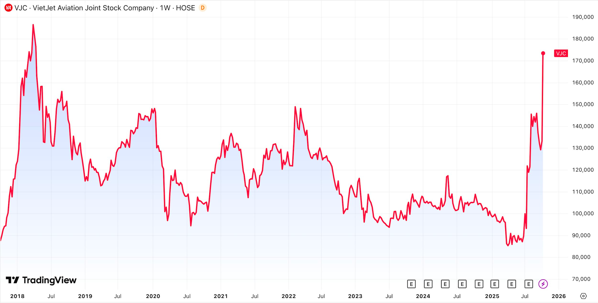 Vốn hóa thị trường của hãng hàng không này cũng theo đó vượt 100.000 tỷ đồng, lần đầu sau hơn 7 năm, ghi nhận mức tăng hơn 70% từ đầu năm.