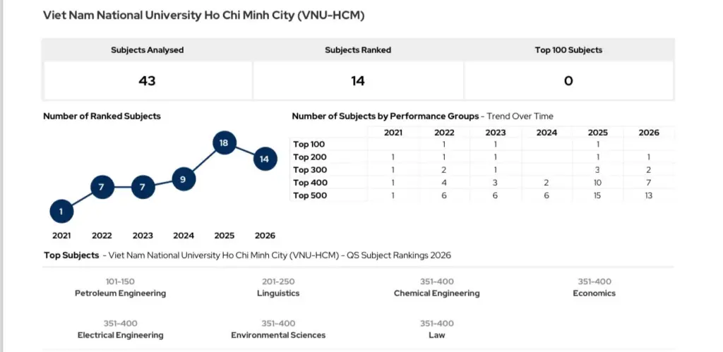 Kết quả xếp hạng QS Subject của ĐHQG-HCM giai đoạn 2021-2026.
