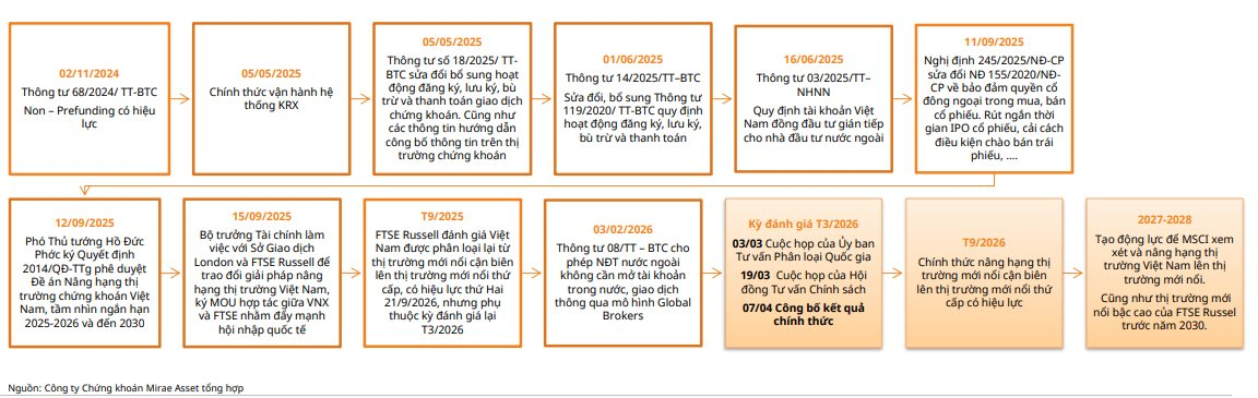 Trên cơ sở đó, Chứng khoán Mirae Asset kỳ vọng Việt Nam có thể được MSCI đưa vào danh sách theo dõi (Watchlist) để xem xét nâng hạng lên thị trường mới nổi trong các kỳ đánh giá tiếp theo vào tháng 6/2026 hoặc tháng 6/2027, với mục tiêu xa hơn là chính thức được nâng hạng vào khoảng năm 2028.