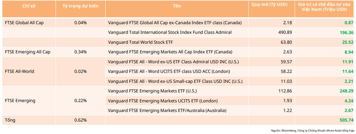 Theo một số giả định về tỷ trọng phân bổ trong các quỹ ETF tham chiếu các chỉ số như FTSE Global All Cap, FTSE Emerging All Cap, FTSE All-World và FTSE Emerging, Chứng khoán Mirae Asset ước tính Việt Nam có thể thu hút khoảng 505,74 triệu USD (tương đương hơn 13.273 tỷ đồng). Lưu ý rằng bảng ước tính này chỉ tổng hợp một số quỹ trong phạm vi nghiên cứu, chưa bao gồm toàn bộ các quỹ liên quan, do đó quy mô dòng vốn thực tế có thể lớn hơn khi tính đến các quỹ ETF mô phỏng chỉ số và các dòng vốn ngoại khác.