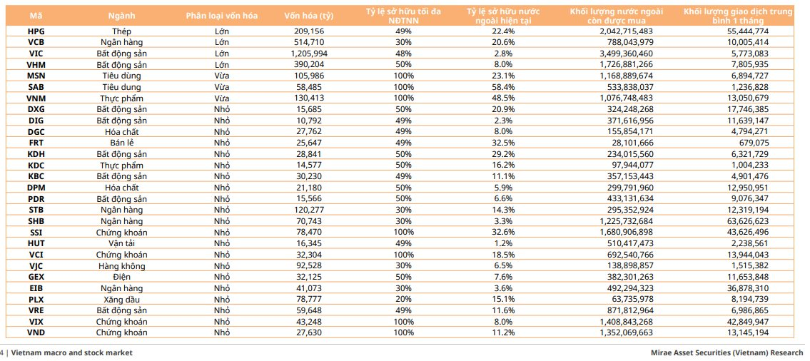 Ngoài ra, FTSE còn xem xét các yếu tố liên quan đến tỷ lệ cổ phiếu mà nhà đầu tư nước ngoài có thể mua so với giới hạn sở hữu nước ngoài (Foreign Ownership Limit – FOL), cũng như tiêu chí thanh khoản. Cụ thể, cổ phiếu phải đạt chuẩn thanh khoản trong các kỳ rà soát bán niên tháng 3 và tháng 9, dựa trên trung vị khối lượng giao dịch hằng ngày theo từng tháng, đồng thời không thuộc diện cảnh báo hoặc kiểm soát và duy trì giao dịch liên tục.