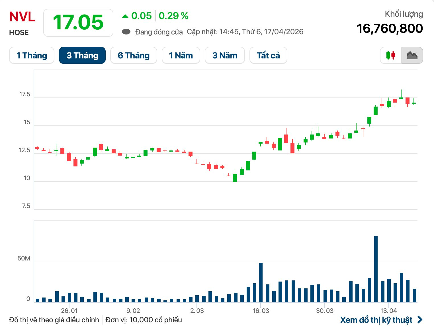 Kết phiên giao dịch ngày 17/4, cổ phiếu NVL có giá 17.050 đồng/cp, vốn hoá thị trường đạt 38.000 tỷ đồng.